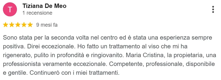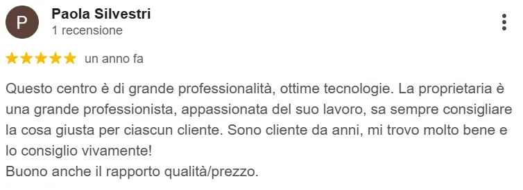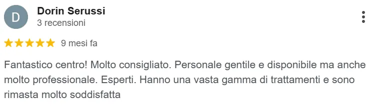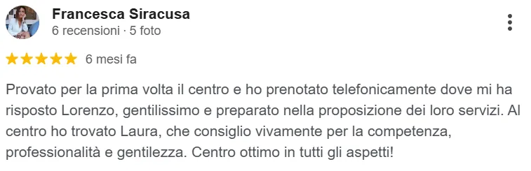 “... consiglio vivamente per la competenza, professionalità e gentilezza. Centro ottimo in tutti gli aspetti”