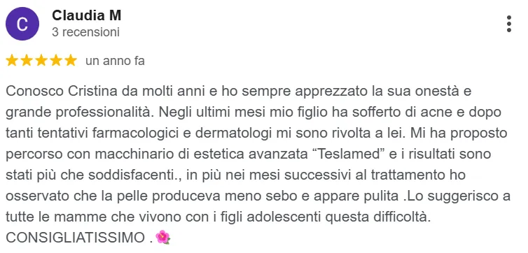 “Negli ultimi mesi mio figlio ha sofferto di acne e dopo tanti tentativi farmacologici e dermatologi mi sono rivolta a lei. Mi ha proposto TeslaMed e i risultati sono stati più che soddisfacenti”